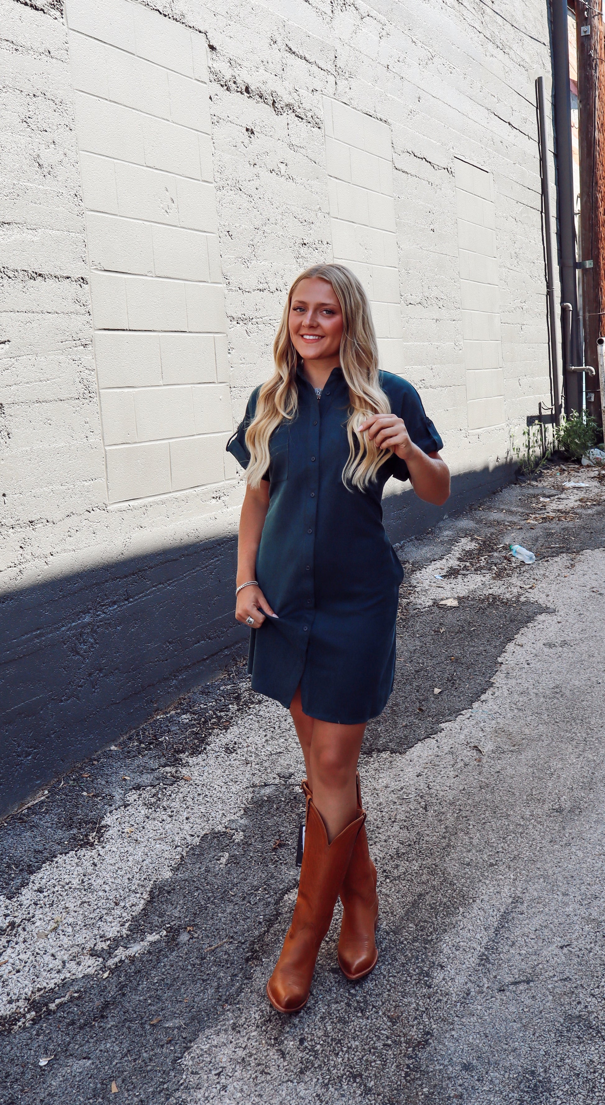 The perfect fall dress. Faux suede and light weight with the most perfect fit for any girl! Button up front to be work so many ways!