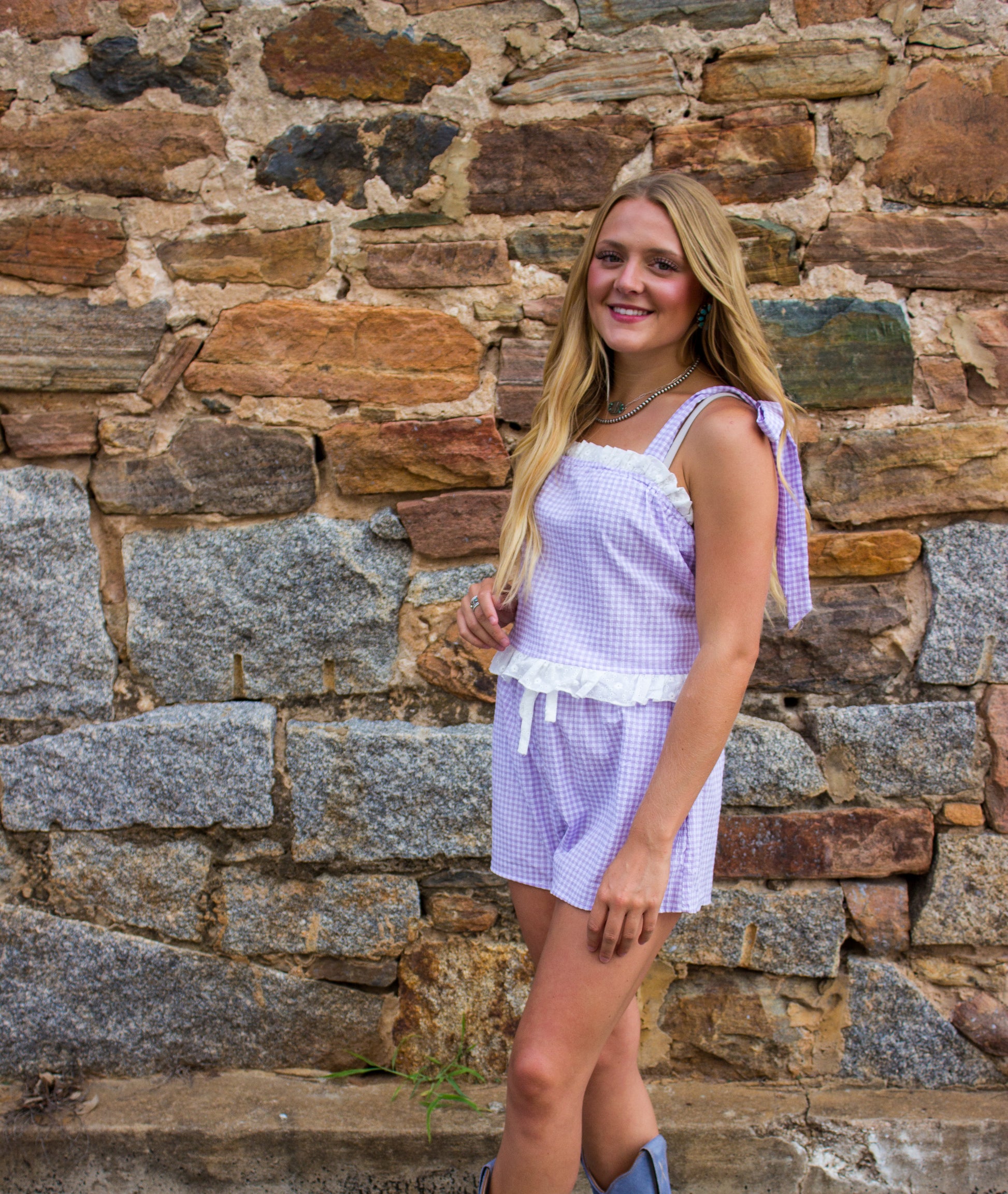 The Effortlessly chic, the Lavender Gingham Set features delicate ruffle details and a flattering true-to-size fit. Perfect for any occasion, this set is designed to make you feel confident and stylish. Available in a range of sizes, with models wearing a small.